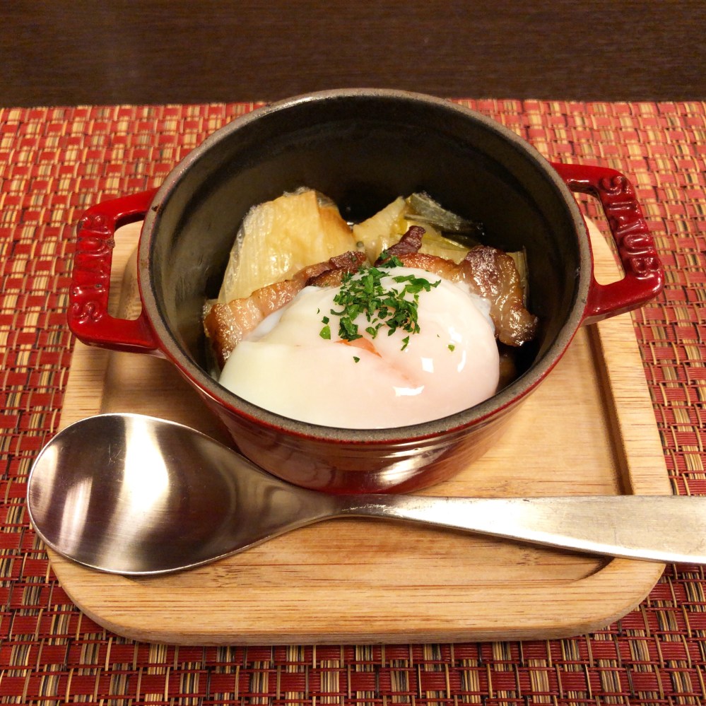 自家製ベーコンと温泉卵。エチュベとは無水加熱のことだそうで、下仁田葱がトロトロになってました。