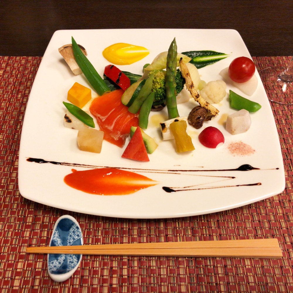 3種の野菜ソース(かぼちゃ、ほうれん草、パプリカ)と塩で頂きました。生のヤーコン(ニジマスの下)を初めて食べました。シャリっとした歯応えで、梨とサトウキビの合いの子みたいな感じだなと思ってググッてみたら、オリゴ糖の塊だそうで、やっぱりなーと。