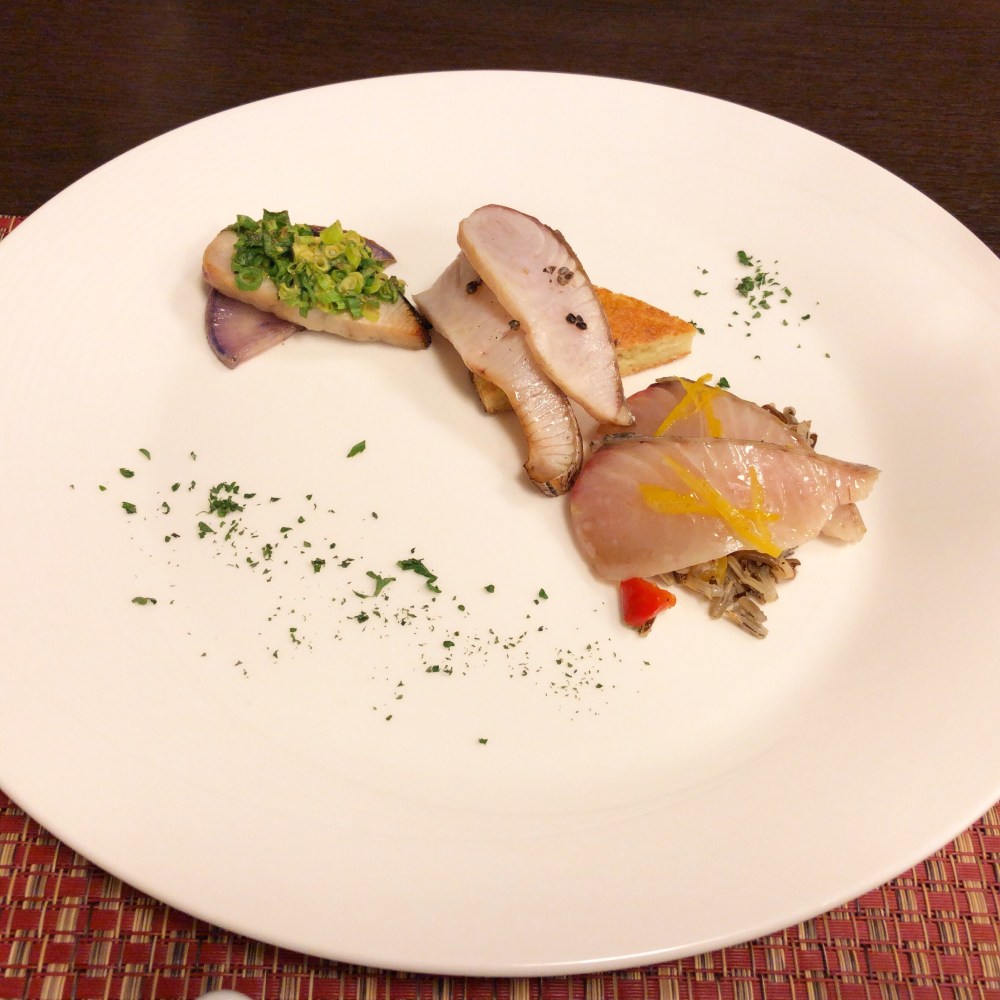 手前からマリネ、半生、燻製で、マリネの下はワイルドライスとじゃが芋、半生の下は山芋(たぶん)焼き、燻製の下は酢大根でした。