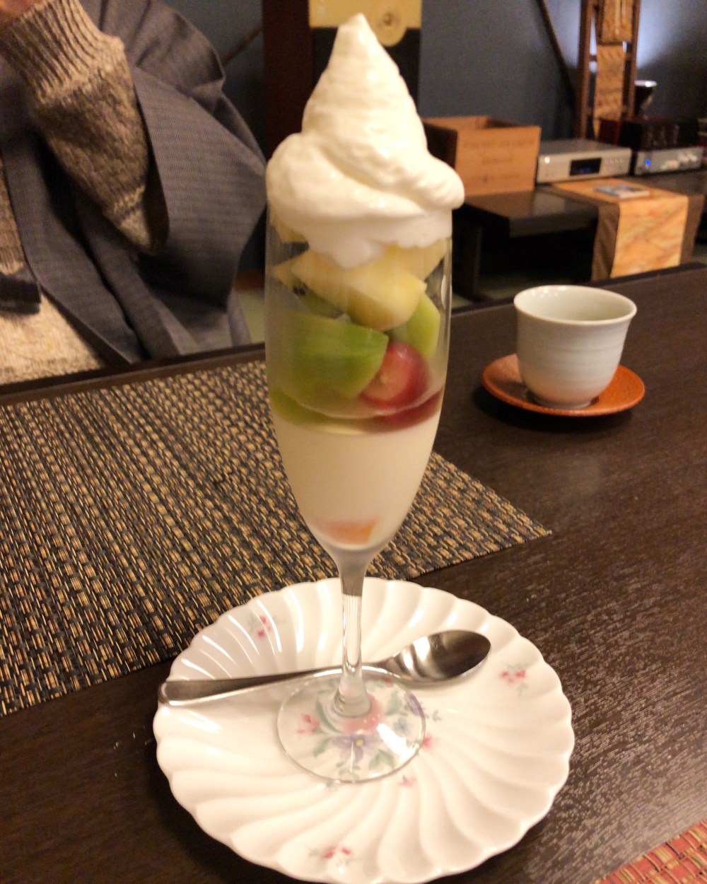 ブラマンジェ。上はヨーグルトしゅわしゅわムースで、りんご、キーウイ、ぶどう、金柑甘露煮入り。