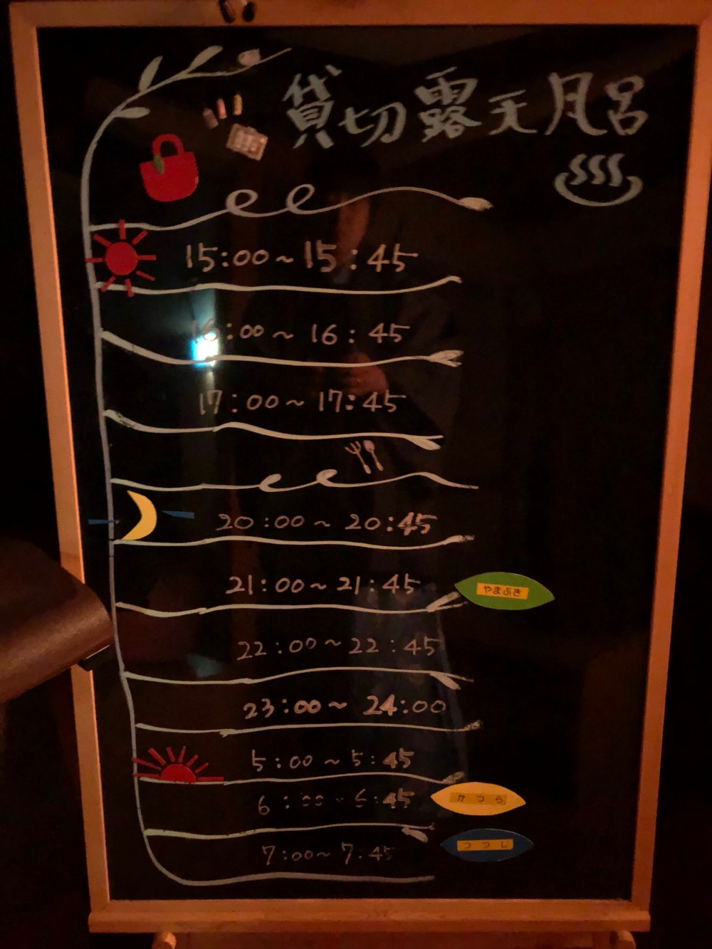 夜撮ったので暗いですが、貸切風呂の時間割表です。