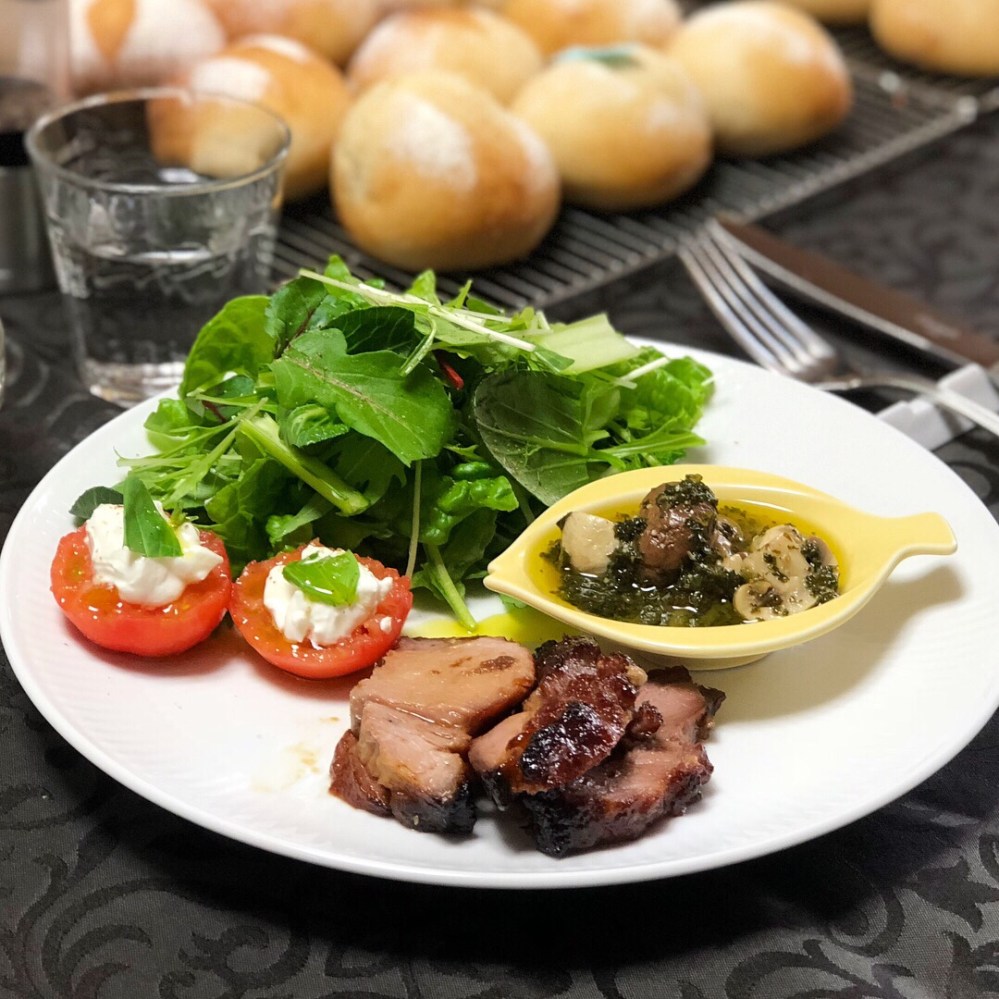 ランチは焼豚とマッシュルームのアヒージョと、トマトに水切りヨーグルトをのっけたカプレーゼ風?などなど。