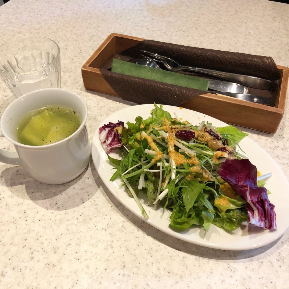ランチのサラダとスープ。たっぷりサラダにお豆トッピングは良いですね。