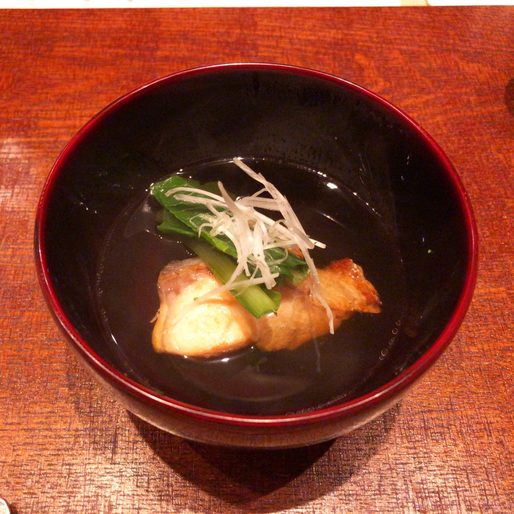 北海道の焼き目時鮭、自然栽培小松菜、自家製焼き餅、青柚子、自然栽培白髪葱。