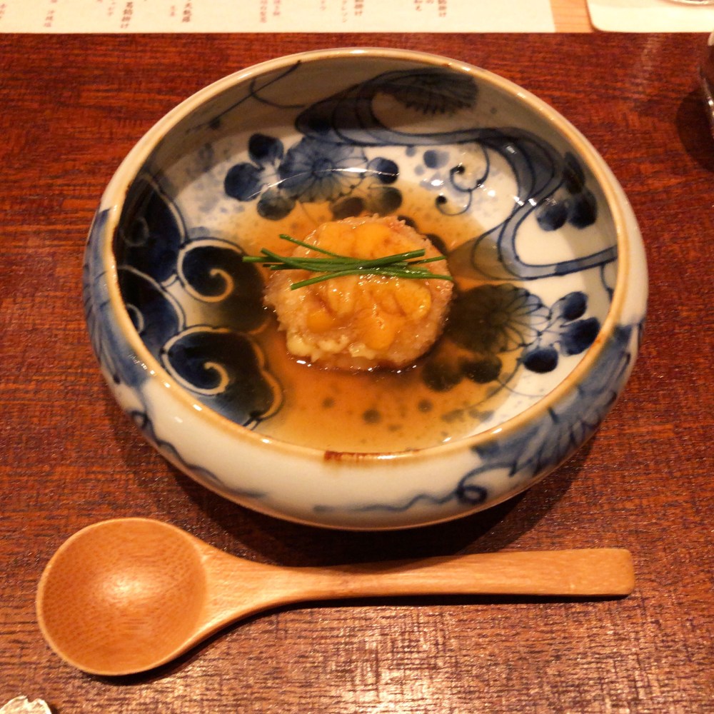 じゃが芋のクリームコロッケ、無添加ムラサキウニ添え、葛餡掛け。