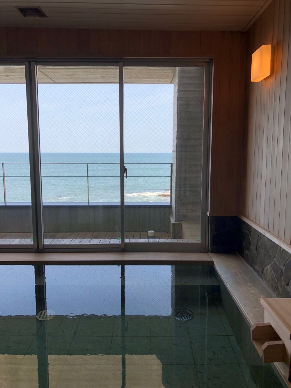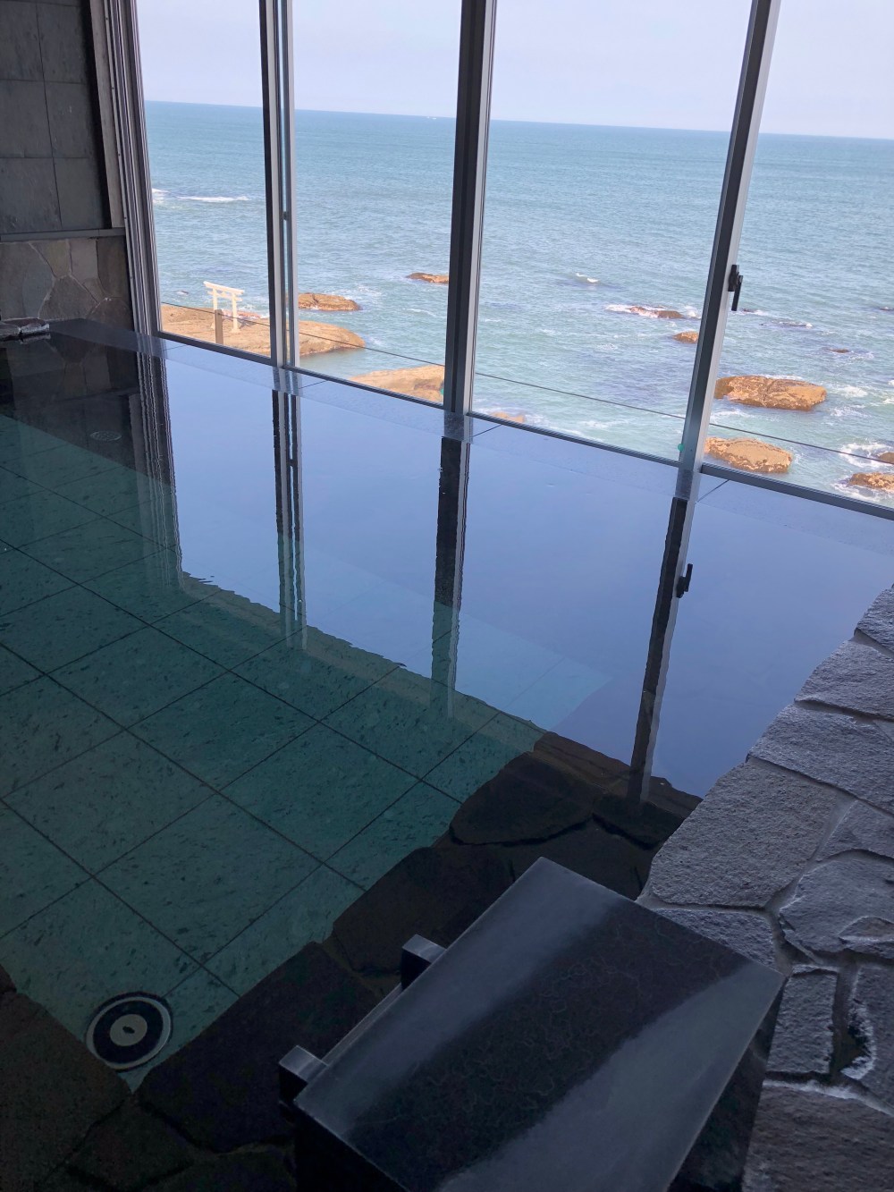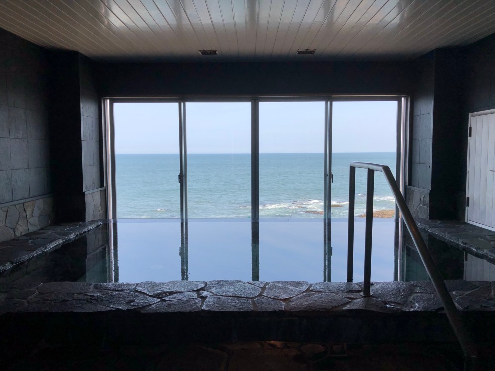 石造りのお風呂は、海と重なって見えました。黒石は玄昌石や鉄平石、十和田石などだそうです。