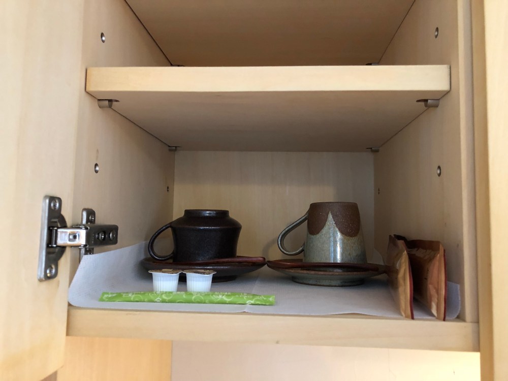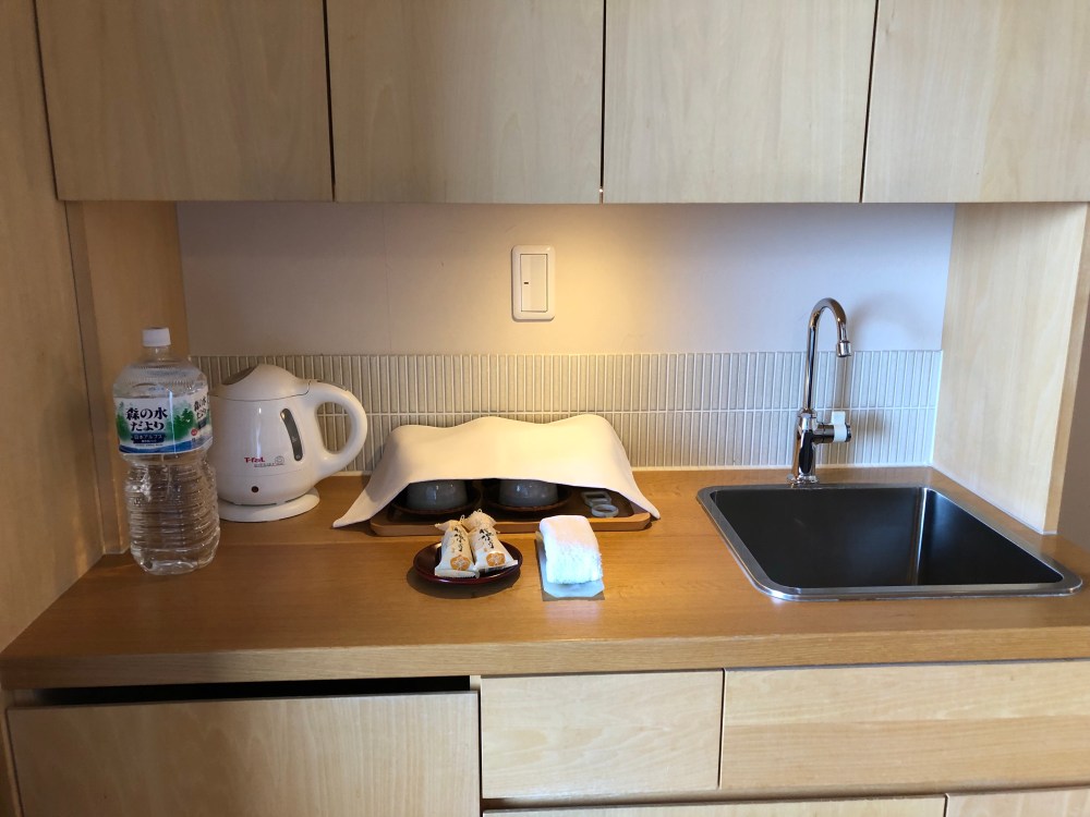 湯沸かしポットとお水、お茶セットにお菓子など。