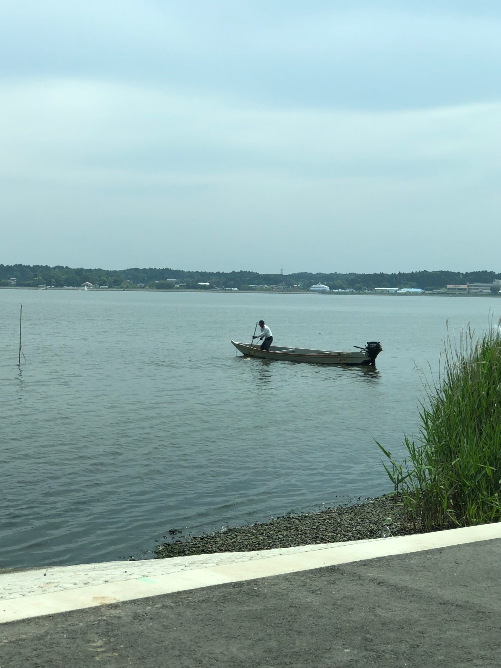 こちらで行われているしじみ漁は、5メートルくらいの長い竿を操って人力で採る方式らしいので、まさにしじみ漁をしているところかなーと。