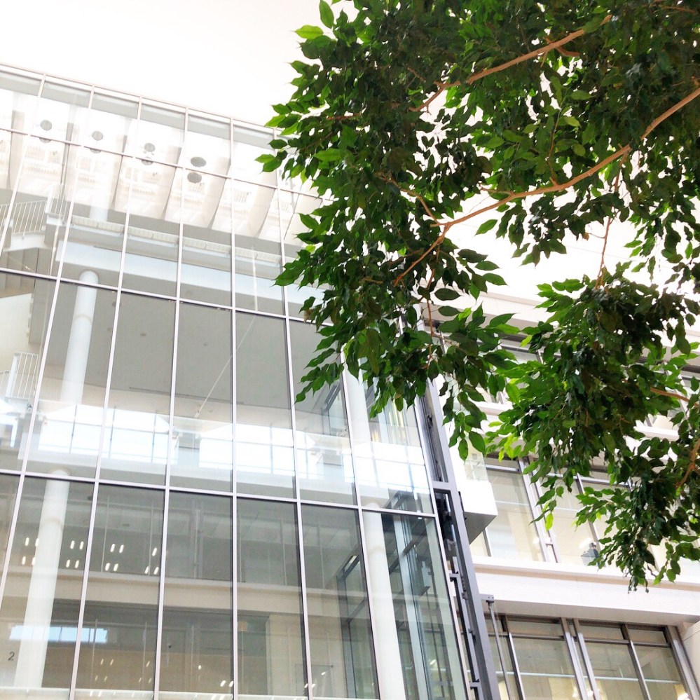 入り口からどーんと吹き抜けのガラス張りになっていて、ビルの中なのに、通路の両側に木が並んでいました。