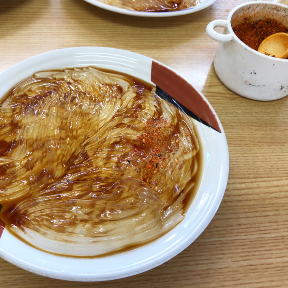 一緒に行ってくれた友人が調味料入れから七味を取り出してくれました。人生初の七味かけところてんです。
