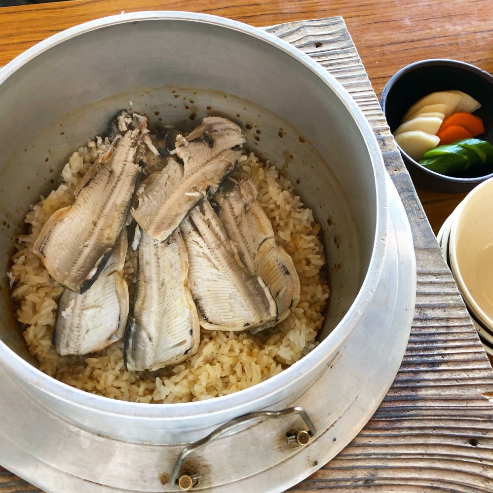 しばらく待つことしばし。鮎の釜飯が登場!釜飯はワンサイズで、3人前です。1人1匹。