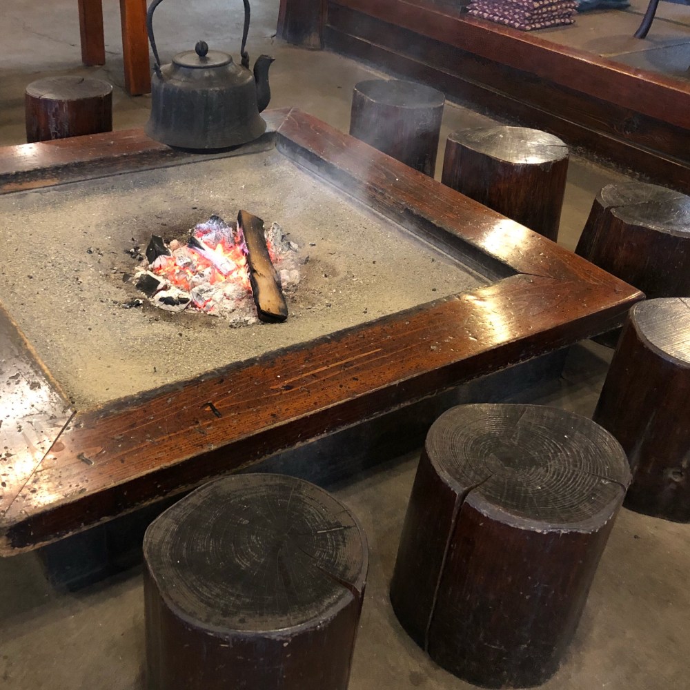 母屋の見晴らし良い席は既に満杯でした。奥の囲炉裏は空いてましたが、冷房が無い中での囲炉裏に炭火という席は流石に暑すぎるということでみんなスルー😅