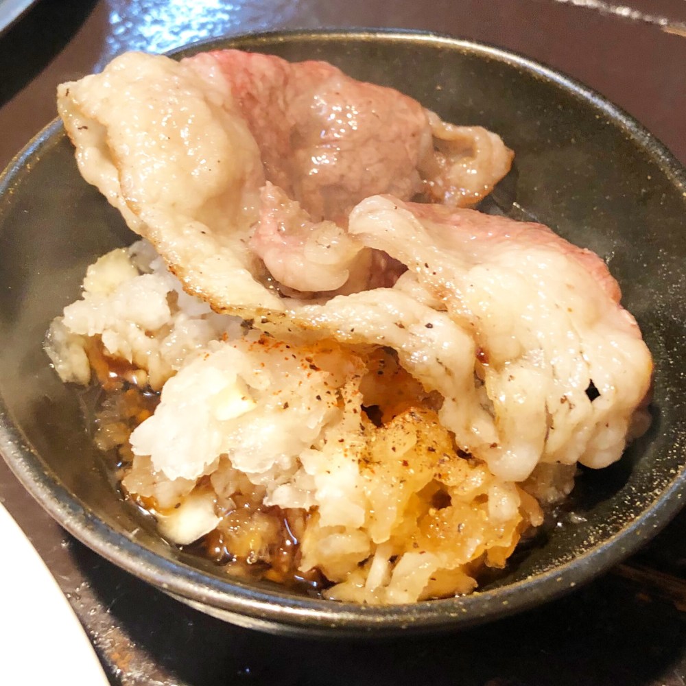 焼きしゃぶ上カルビは鬼おろし入りのタレで頂きます。肉にたっぷりごま油が塗ってあったらしく網に薄いお肉があまりくっ付かないままで上手く焼けました。