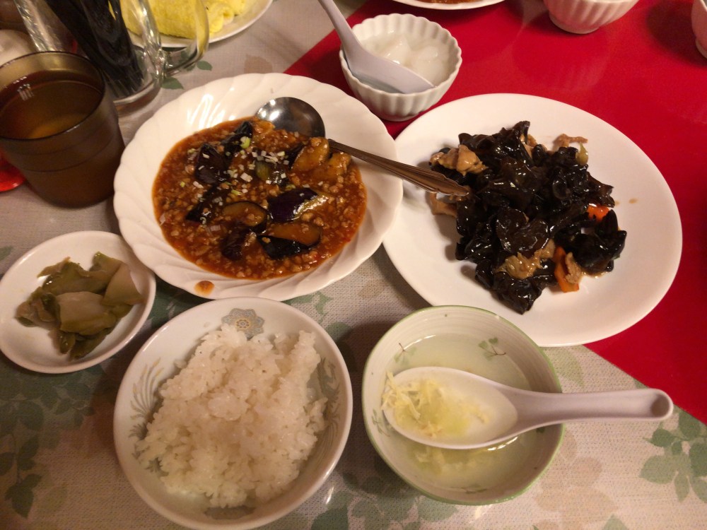 本日のランチから、麻婆茄子と豚肉とキクラゲの炒め物。搾菜とスープ、杏仁豆腐も付きました。