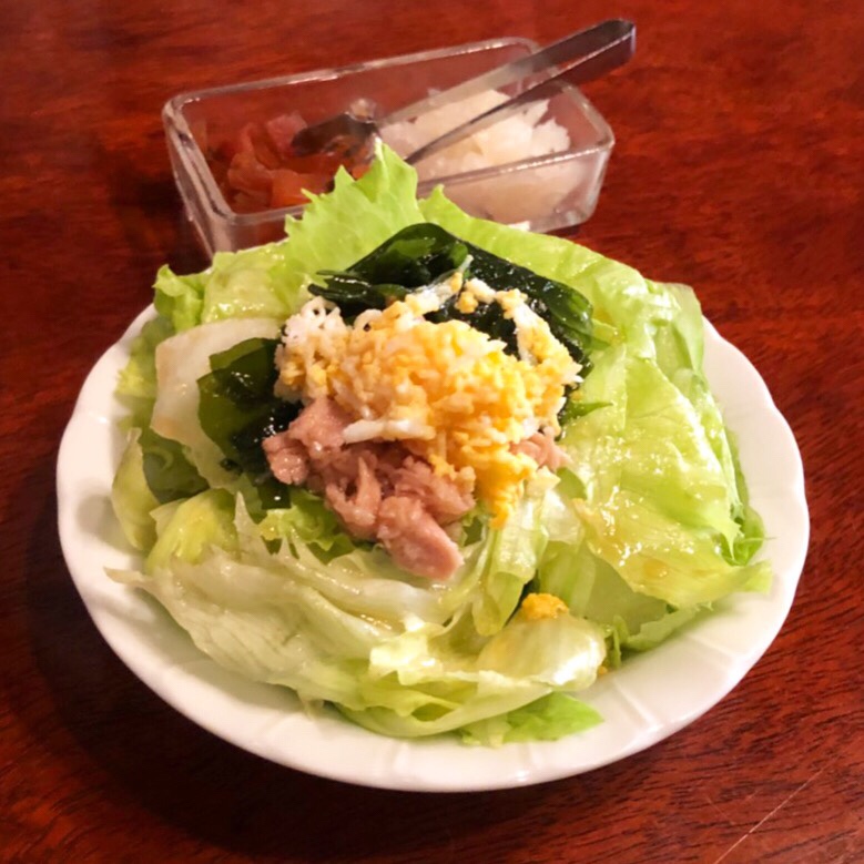 以降は友人の写真を拝借。まずは、サラダとカレーのお供から。