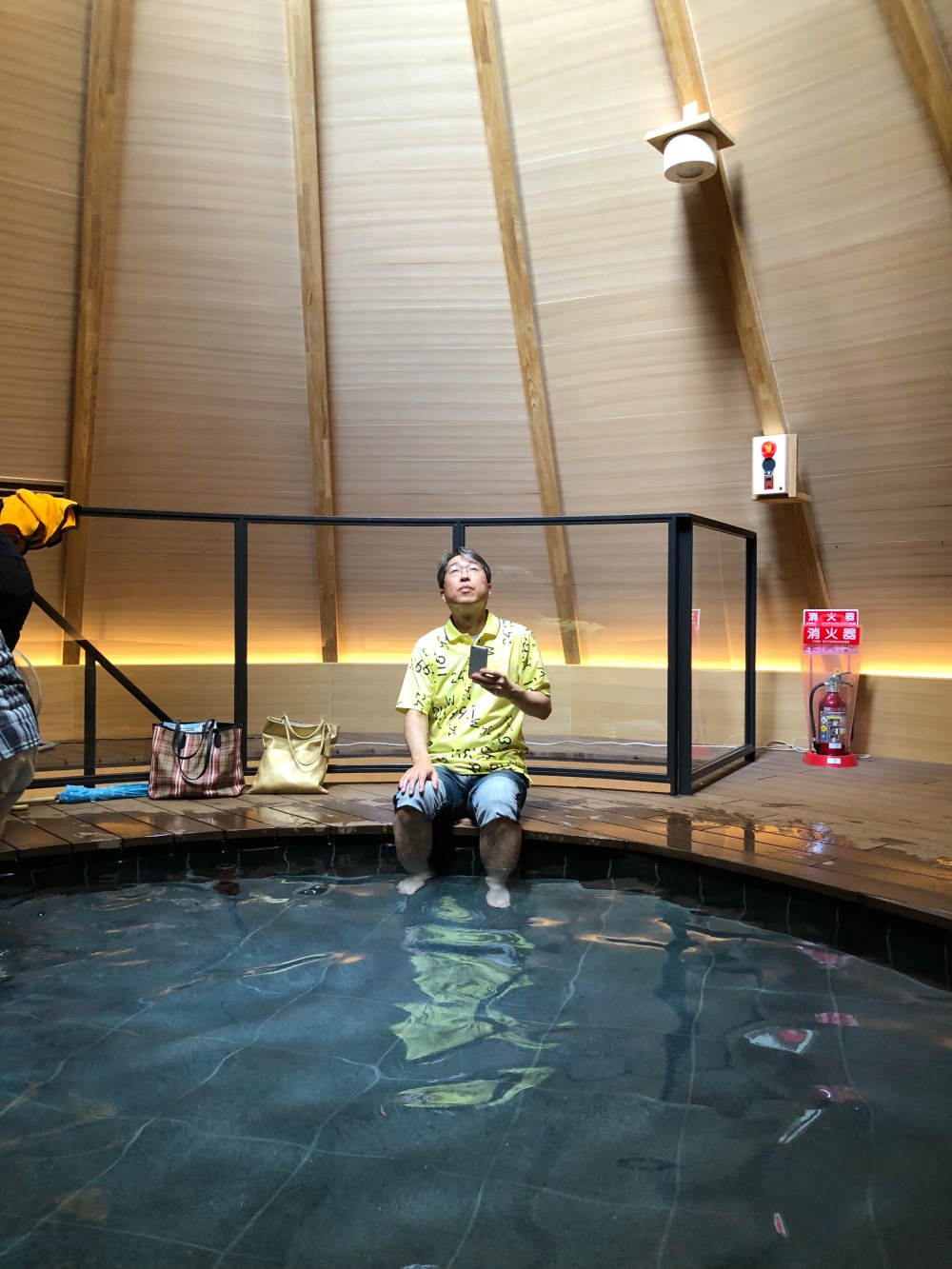 足湯につかりながら、天井の作品を眺めます。見る場所によって見え方がかなり違いました。