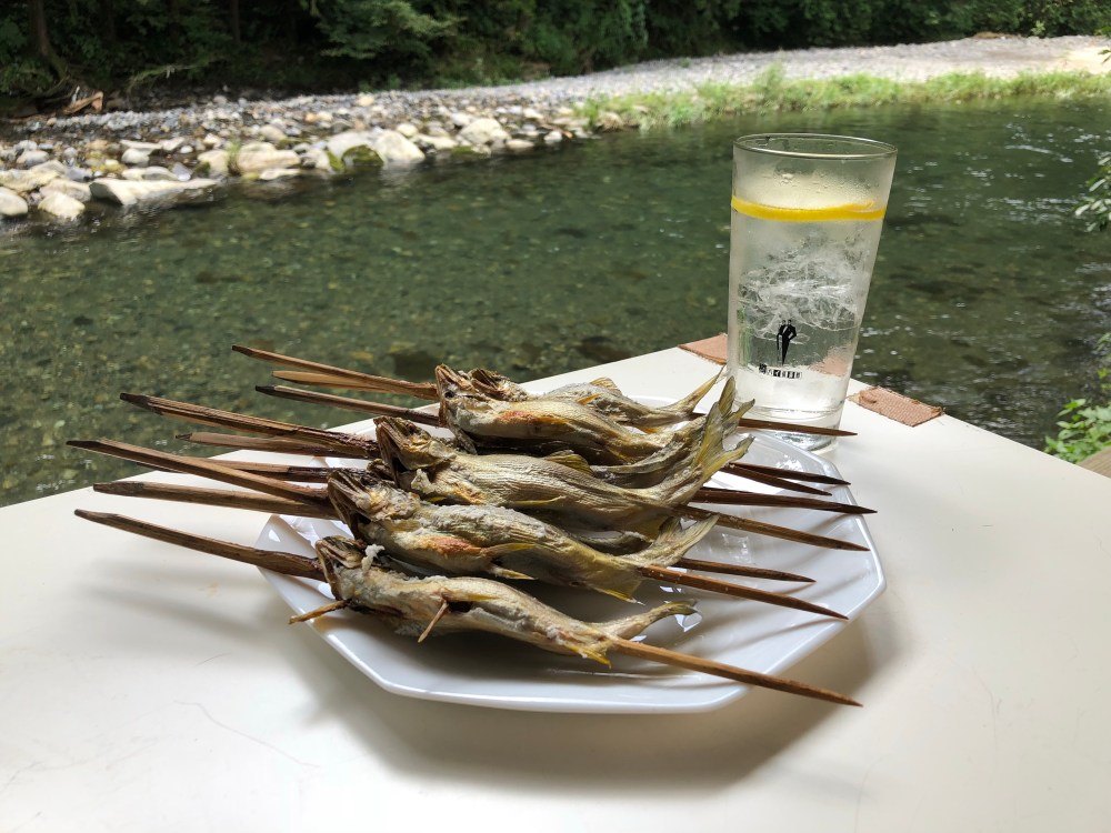 何はさておき、天然鮎の塩焼きを。1人二本。
