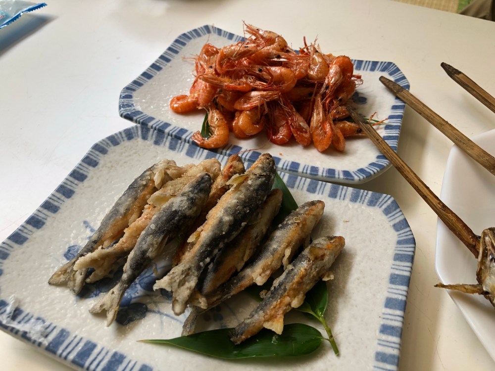 川海老とアイソの唐揚げ。アイソとはこの辺りの呼び名で(うちの地元だとハヤでした)、ウグイとも言うようです。