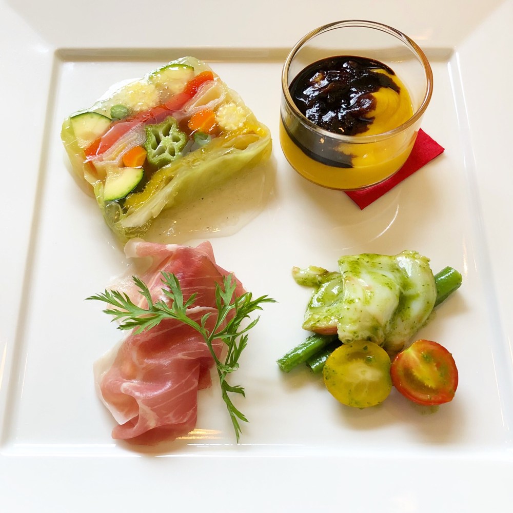 かぼちゃの冷製ポタージュには美味しいバルサミコ酢がかかってました。生ハムの下は季節のイチジク。野菜のテリーヌにタコのバジルソース和えなど。
