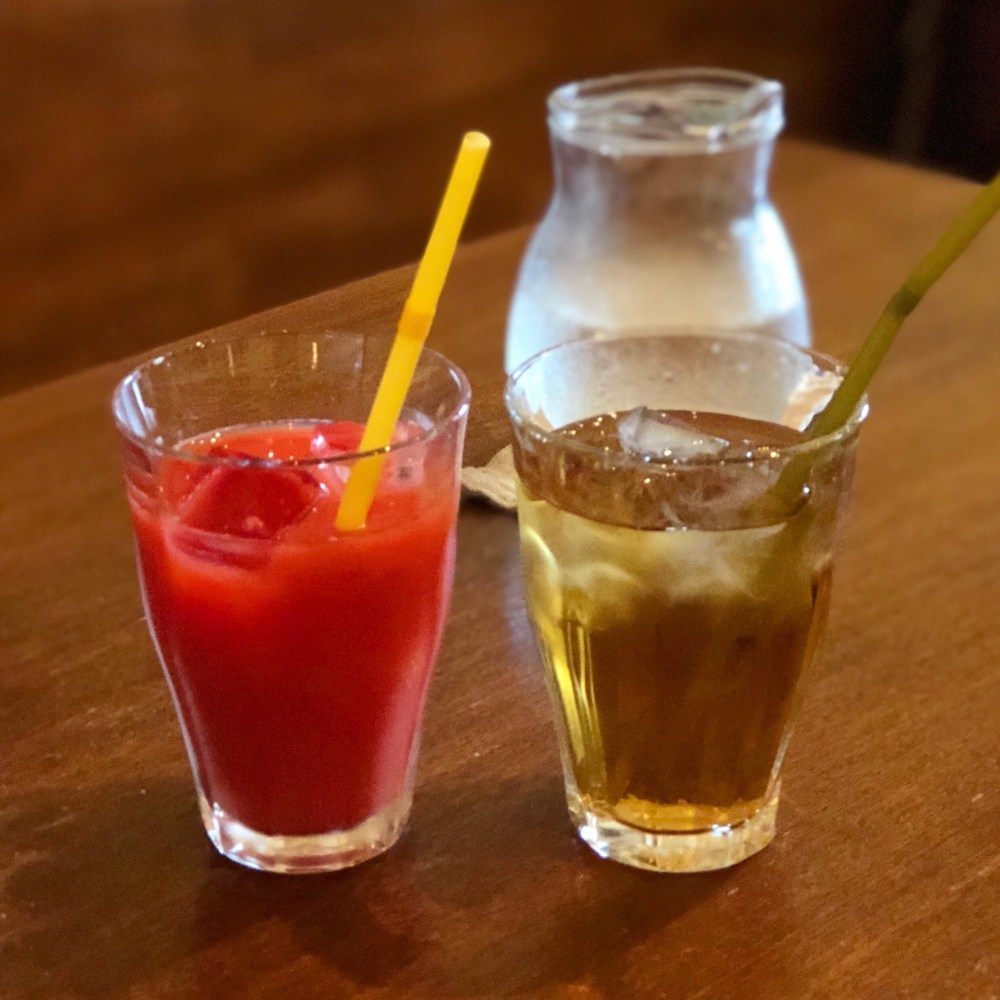 ドリンク付きで、終了。赤いのはブラッドオレンジジュースです。私はアイスティーでした。