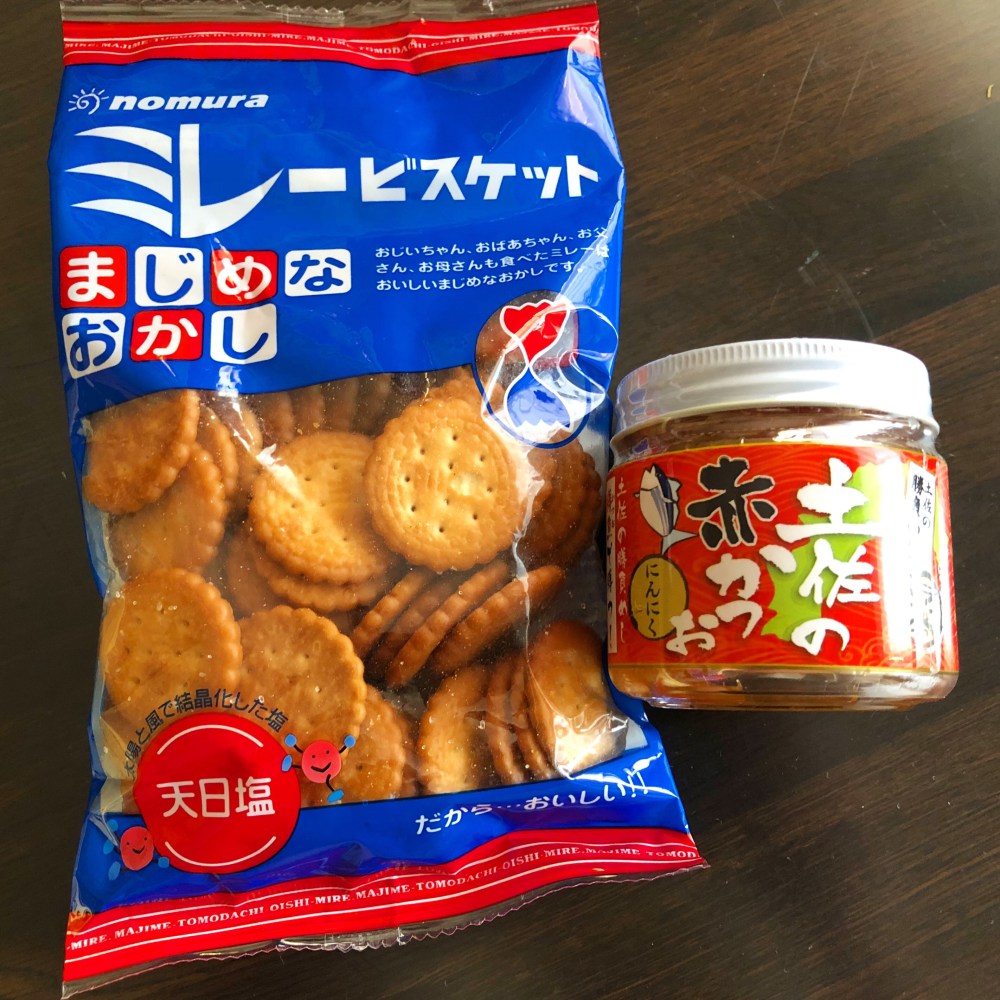 肝心のお土産は、土佐の赤かつおです。旅先で荷物になるしと。私リクエストだったので、中身は知っていたはずな所への超サプライズなプレゼントでした。あとミレービスケットも。