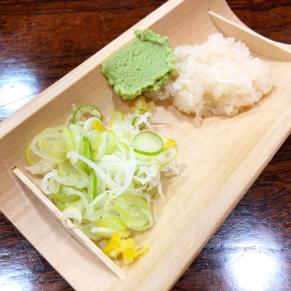 席に着くと、お茶と一緒に薬味とつゆがやって来ました。