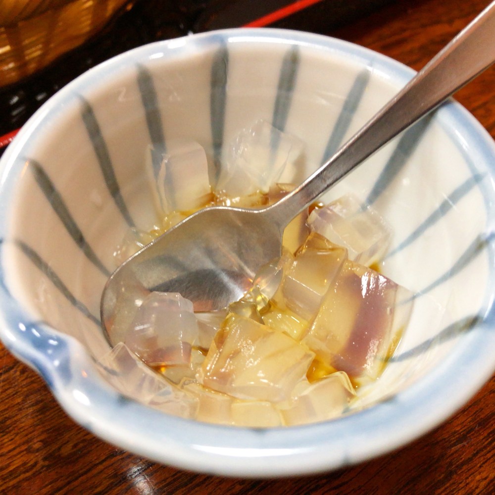 蕎麦湯と一緒に冷たい黒蜜寒天も来ました。このちょこっとが美味しくてほっこり。