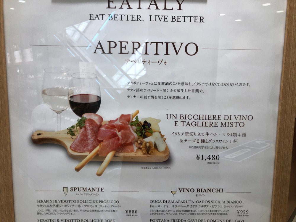 とりあえず食材だけみて帰ろうかなーと一回りした所で、カフェのカウンター側(Caffè Vergnano)に、アペリティーボの看板を発見!