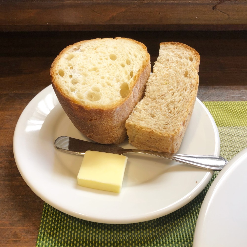 パンは全粒粉系とバゲット系の大きめサイズがどどーんと来ました。バター付き。