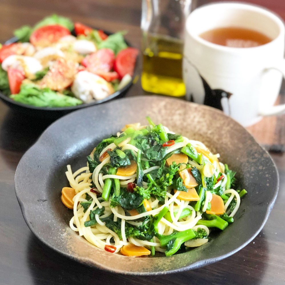 今日のお昼はからすみとかき菜のペペロンチーノを作りました。熱々でまだ湯気が立ってますね。家ならではということで、からすみはたっぷりで。