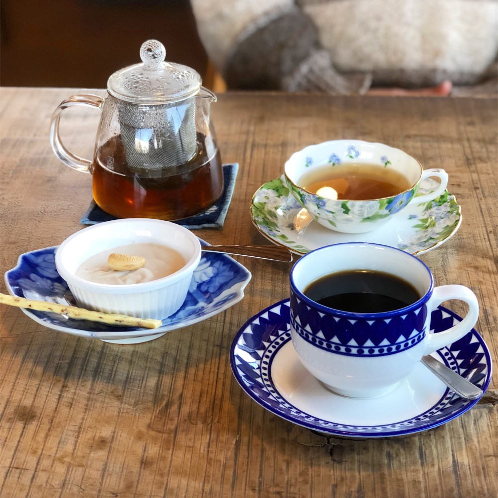 飲み物はハーブのトゥルシーティと群馬県桐生市にある珈琲豆焙煎Kaffaさんのコーヒーで。