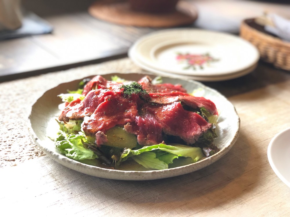 石窯ローストビーフサラダのアップ。来た人全員がこのサラダを注文してましたが、納得の美味しさでした。