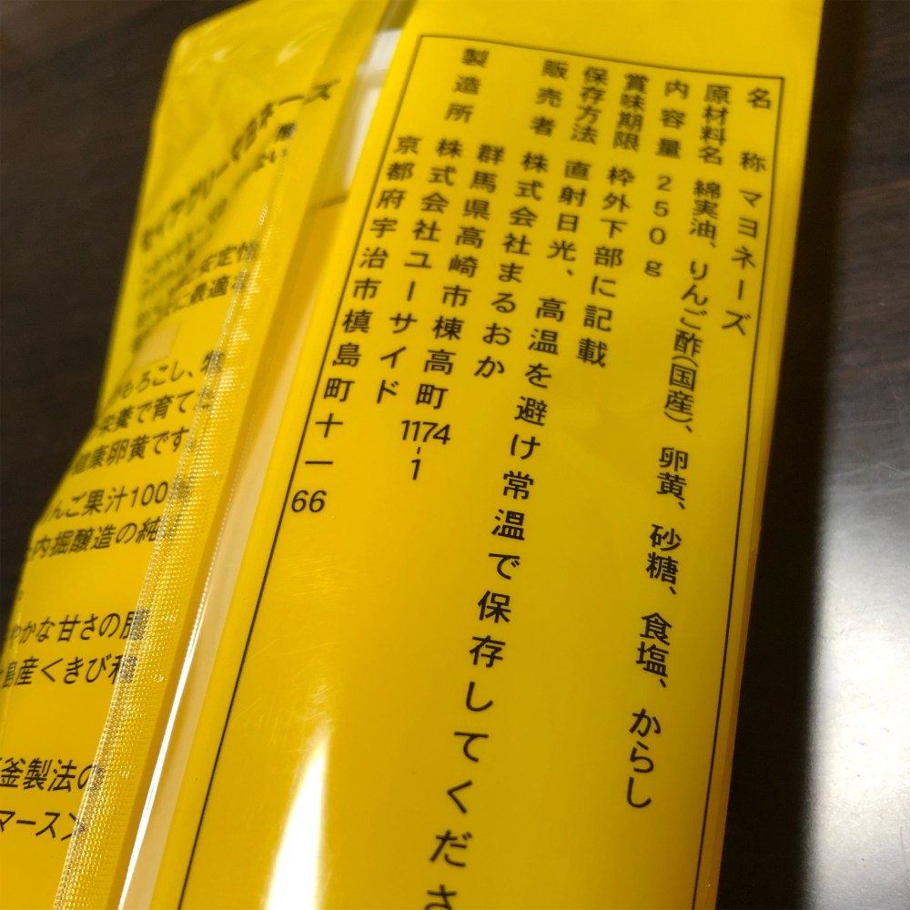 が、まるおかさんに置いてあったのは、まるおかのマヨネーズというこれでした。裏を確認すると、販売者がまるおかさんでした。製造所は京都にあるユーサイドさん。