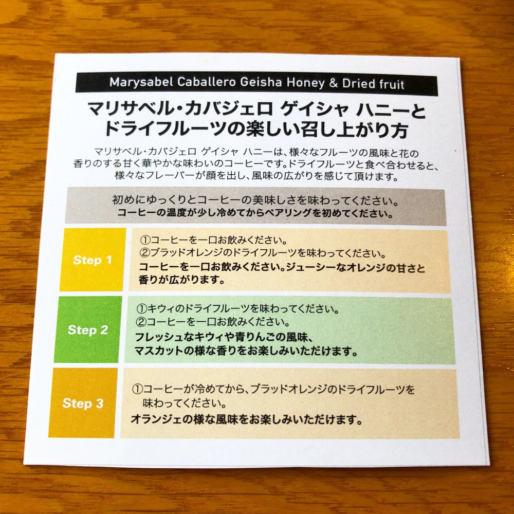 メニューを見るとついつい頼んでしまうのが、ドライフルーツとペアリングしたコーヒーのセットで、今回はマリサベル・カバジェロ ゲイシャハニーとドライフルーツのペアリングでした。