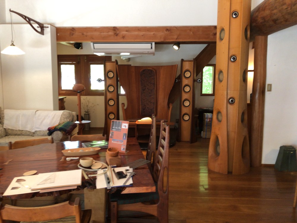 天井サイズの360度木製スピーカーが何台もあったり、大きな木製の椅子があったり。全て小島さんの作品だそうです。