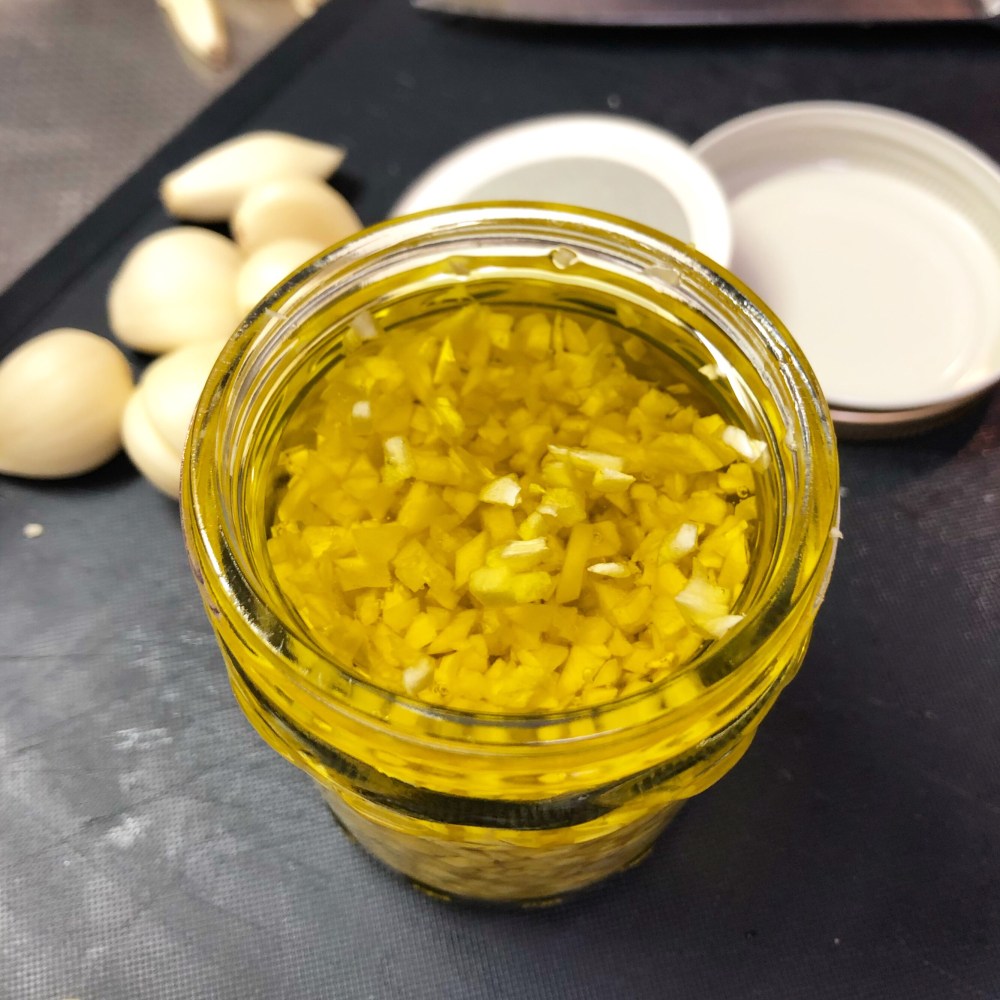 炒め物用などにすぐ使えるようスライスしたにんにくをそのまま漬けこみました。左の白っぽい方が太白胡麻油で、右の黄色っぽい方がオリーブオイルです。
