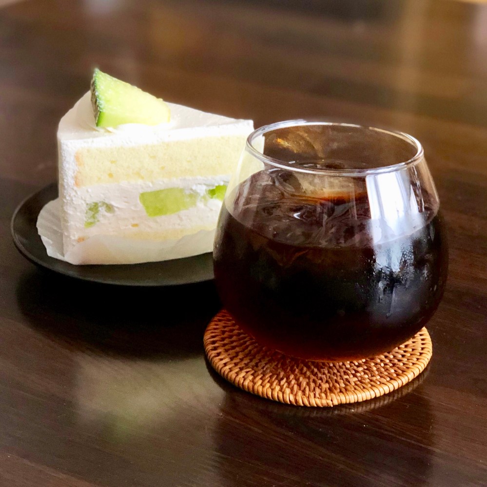 写真は今日買いに行った自家焙煎珈琲屋さんである tonbi coffee さんのメロンショートケーキと、珈琲きゃろっとさんのアイスコーヒーブレンドで作ったアイスコーヒーです。