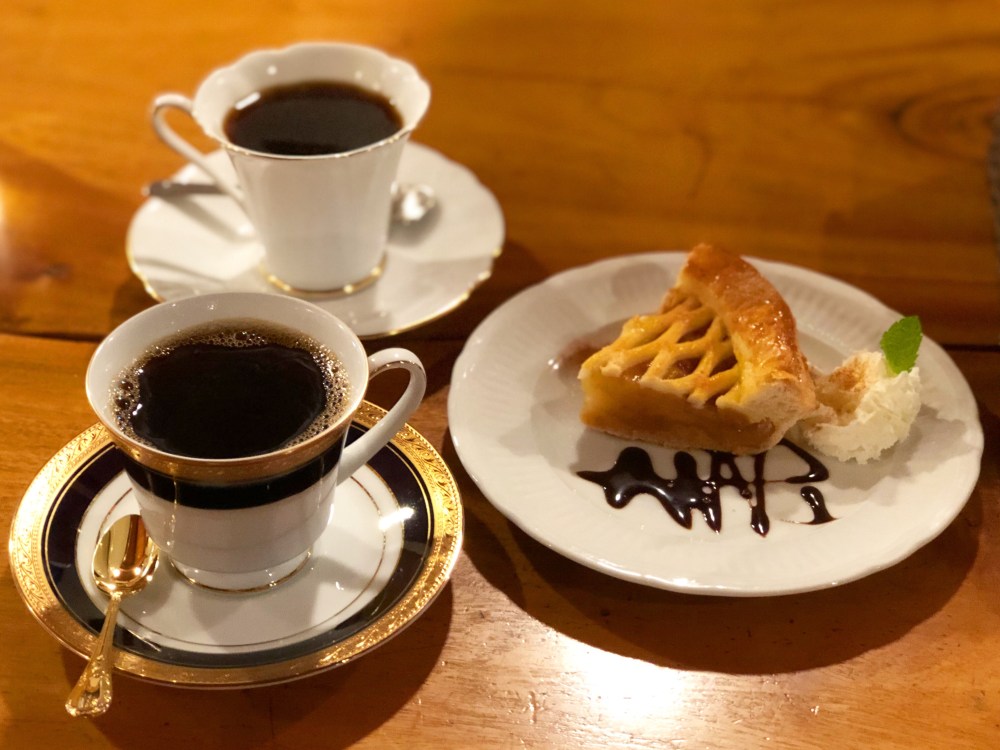 離山房ブレンドと離山房スペシャルブレンド。小腹ふさぎにアップルパイも頼みました。