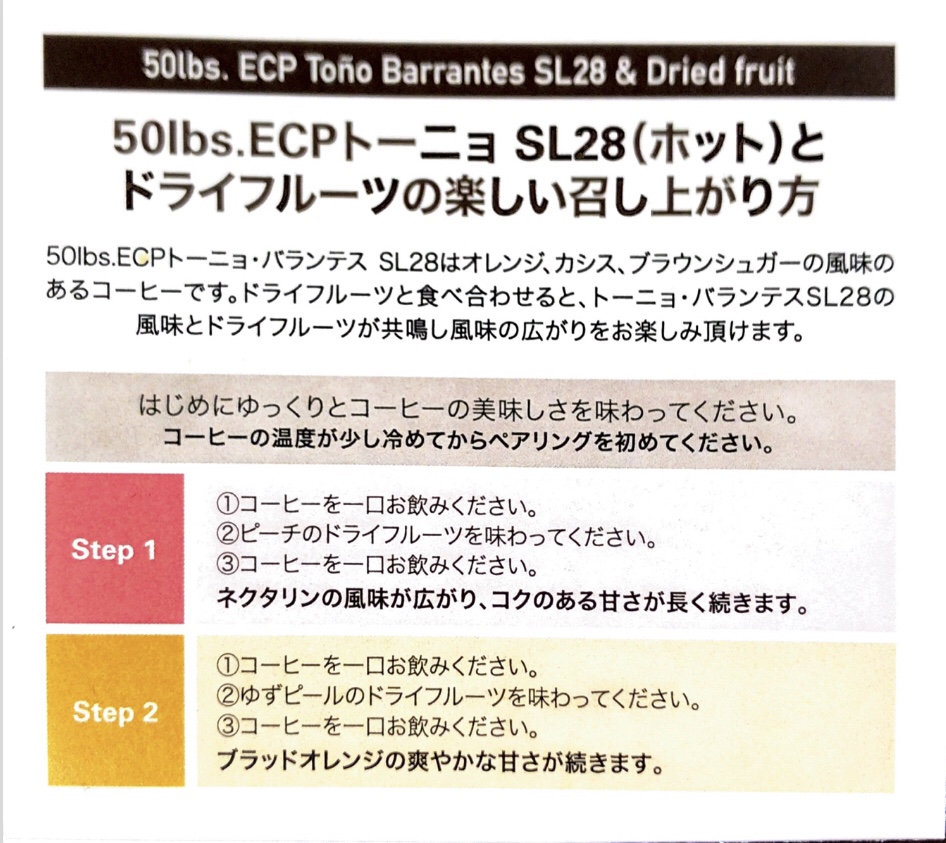 今回は50lbs.ECP トーニョ・バランテス SL28 とドライフルーツのペアリングでした。