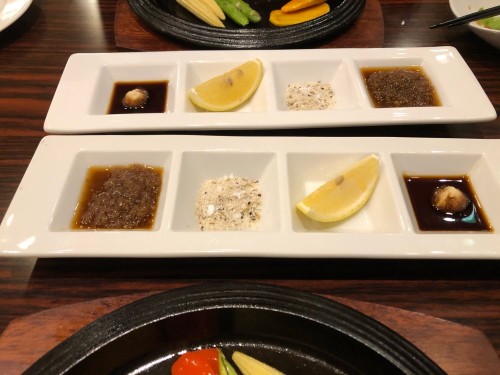 タレは左からホースラディッシュ醤油、レモン、岩塩、ニンニク醤油。