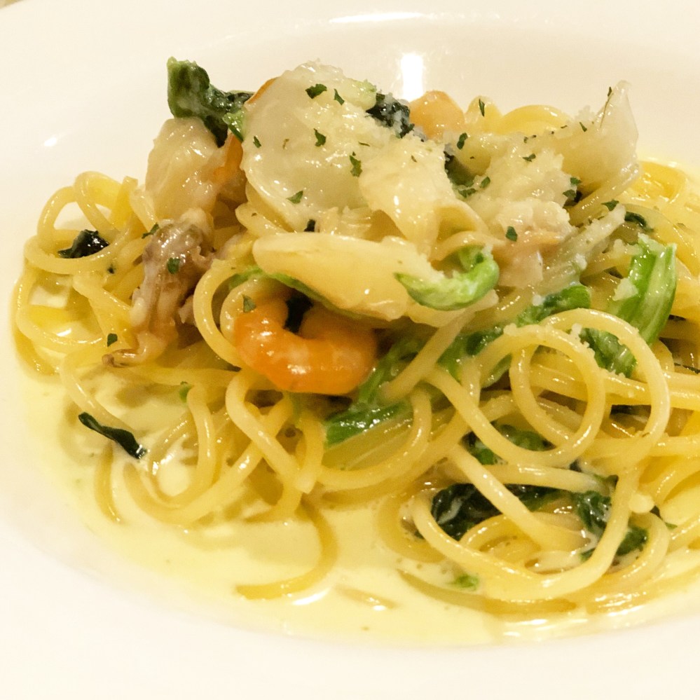 ミニパスタは魚介とほうれん草のクリームソース。やっぱり大きめ😅