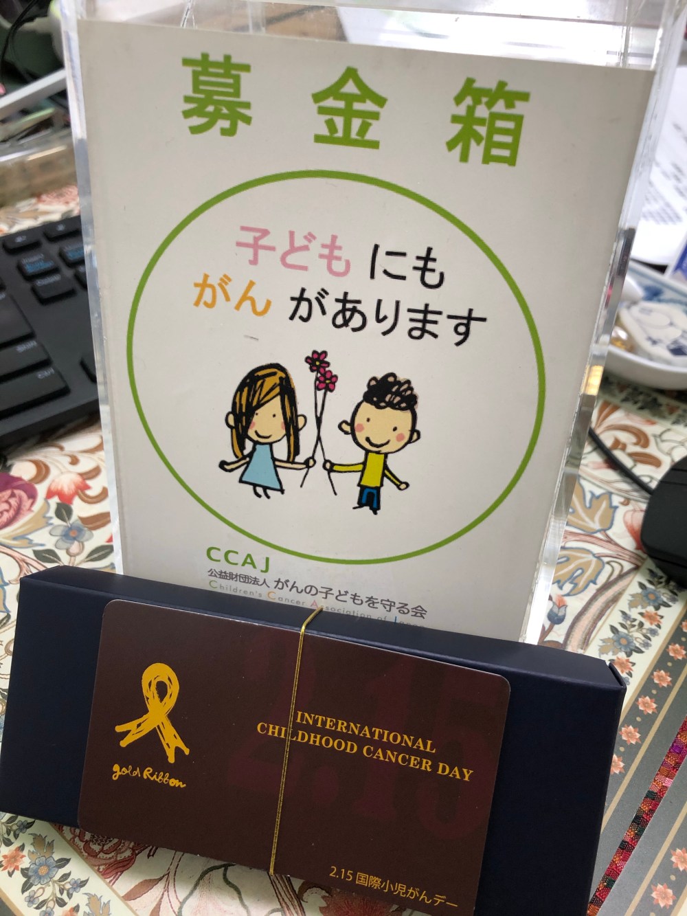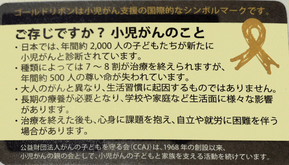 以前、がんの子どもを守る会(CCAJ)に募金した際、ゴールドリボンピンを頂きました。ゴールドリボンは小児がん支援の国際的なシンボルマークです。