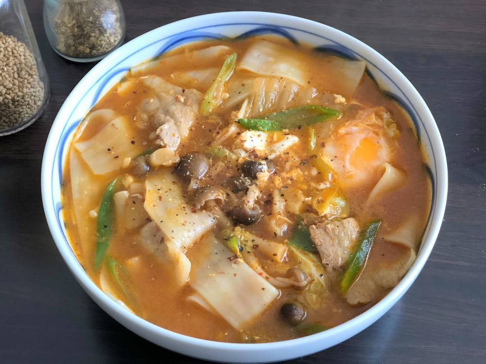 昨夜はチゲ鍋だったので、今日のお昼は残りスープにひもかわうどんを放り込んでみました。