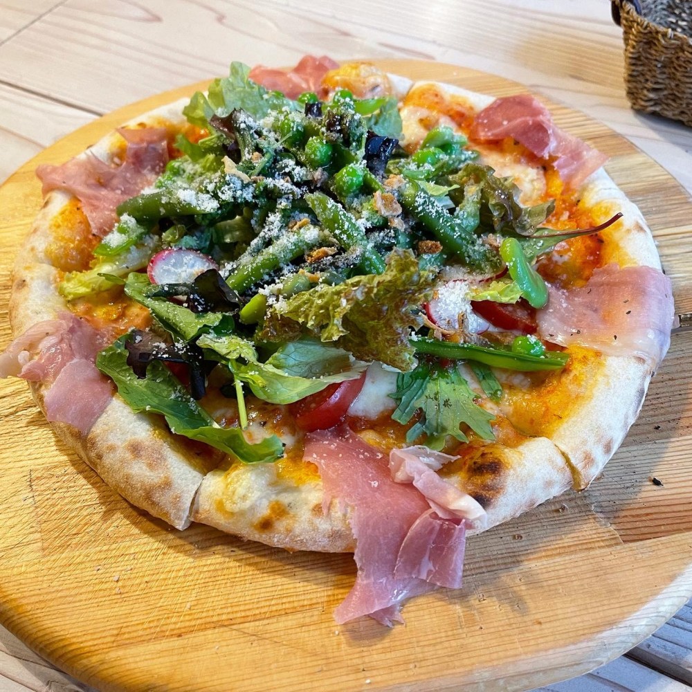 サラダピザはその名の通り、たっぷりの春野菜と生ハムに裏山から採り立てという蕨入りでした。