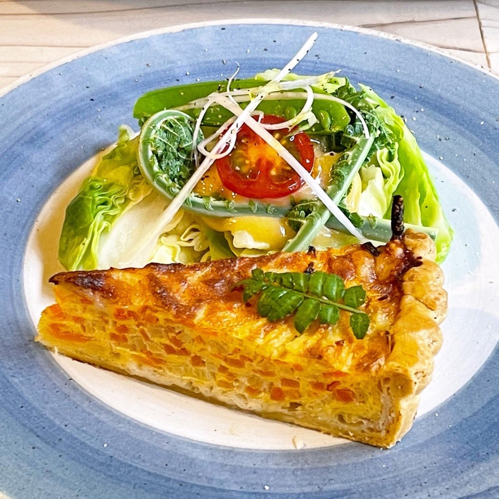 4月の前菜は、春キャベツのサラダ、自家製マヨネーズ添えと筍と人参のキッシュ、山椒風味でした。
