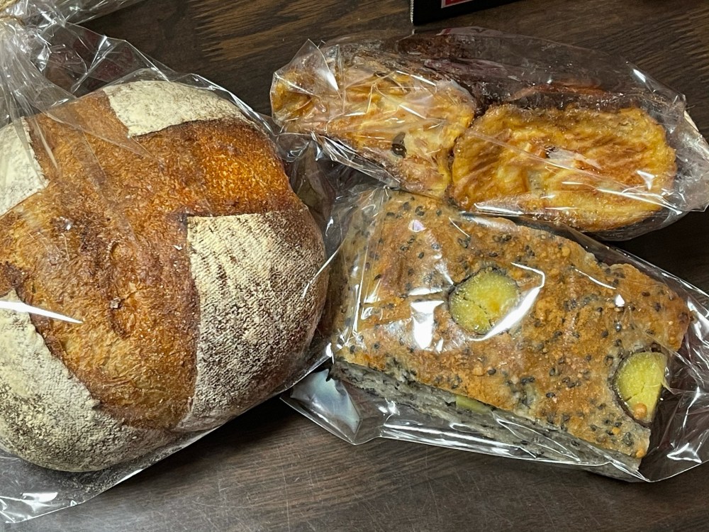 カンパーニュ、ライ麦バケットのフレンチトースト、さつま芋の黒ごまフォカッチャです。