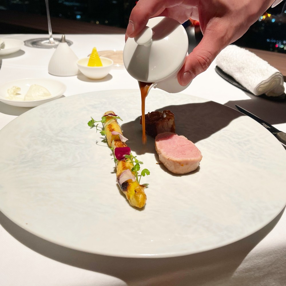 わーすばらしいコース。日本らしい食材に日本人シェフらしい細やかな盛り付けだとは思いますが、それを除くと日本だかフランスだかもう全然わかりませんね。ミシュラン三つ星レベルだと思います。
