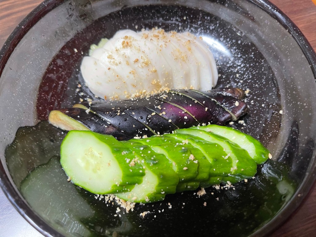 ナスが良い色に漬かるのが不思議です。