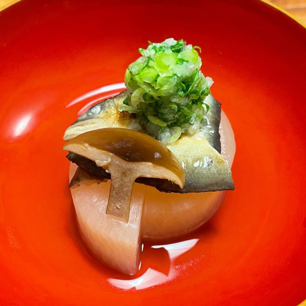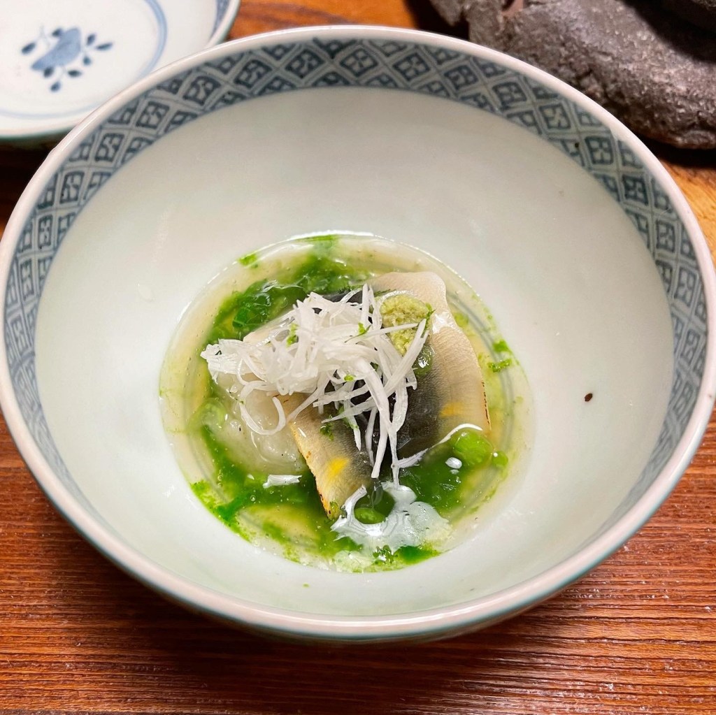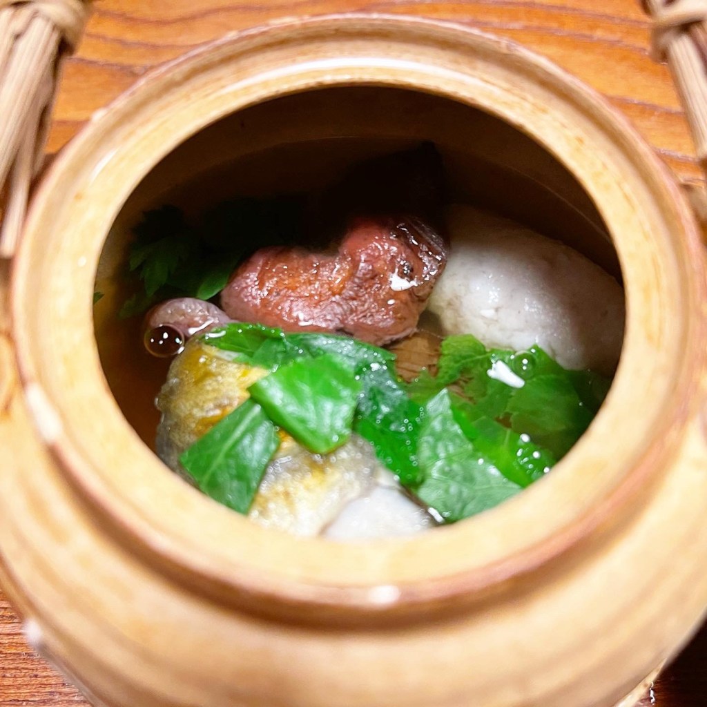 鮎の蕪蒸し。蕪の葉の緑が爽やかでした。濃い味の後はあっさりと。