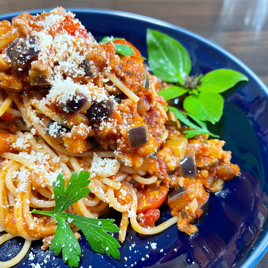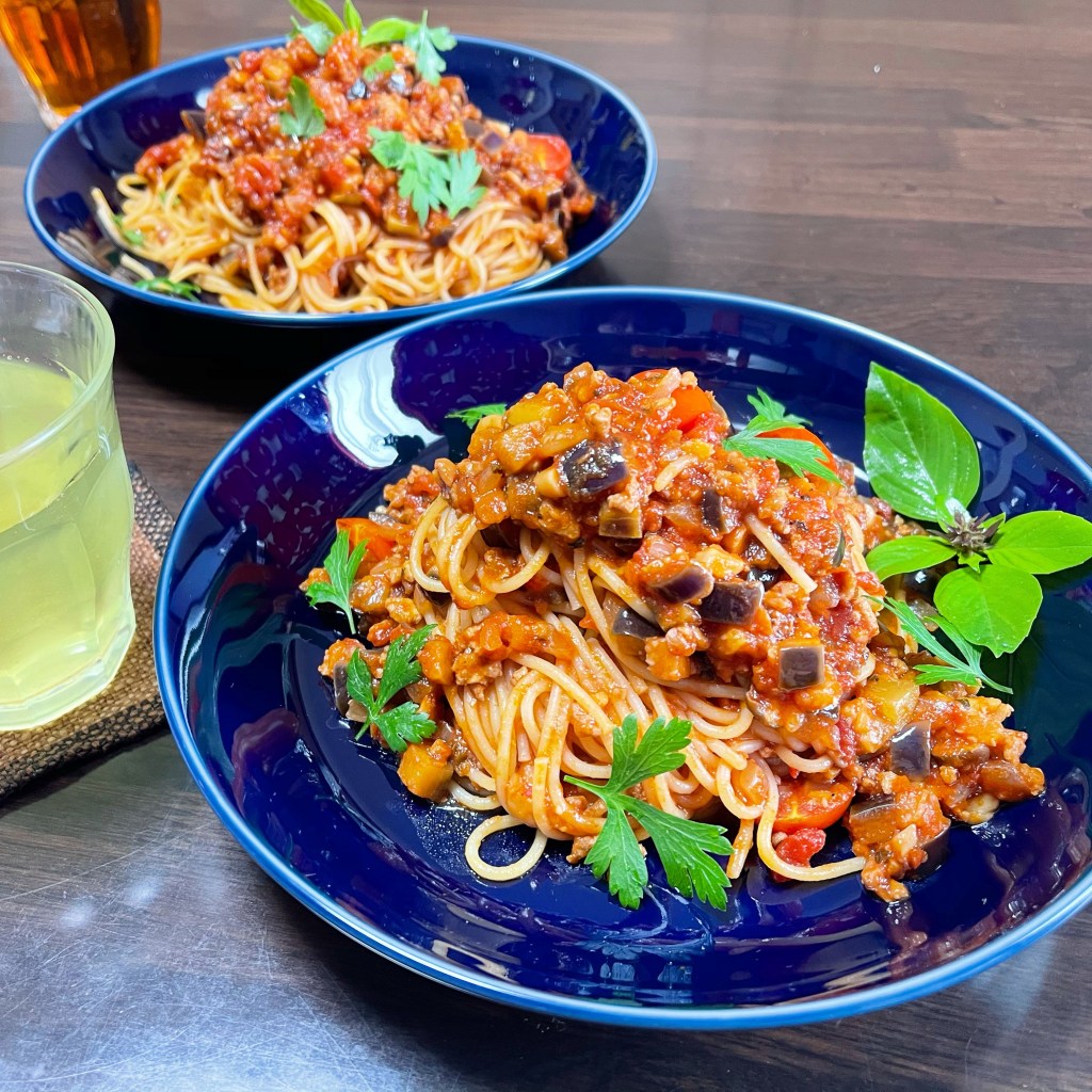 休日真ん中の家ランチはナスミートスパゲティにしました。